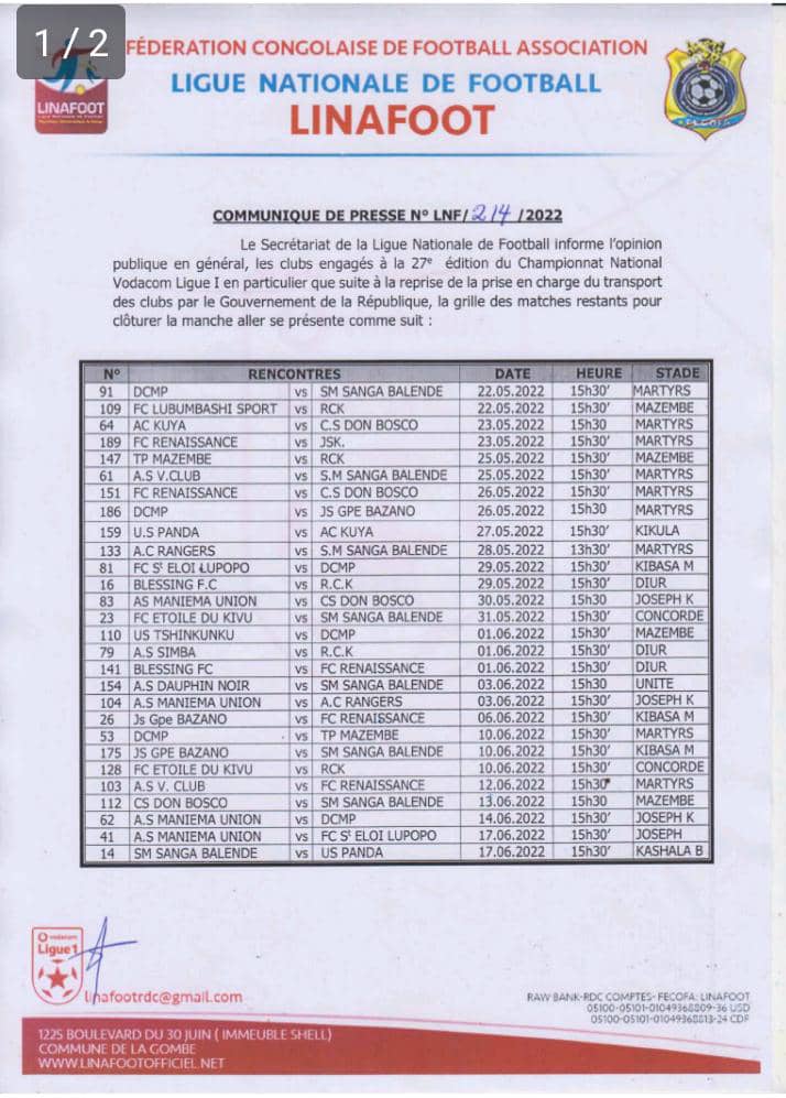 La reprise du championnat national de football en RDC est donc pour le dimanche 22 Mai prochain.