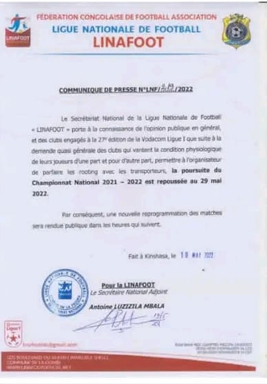 Initialement prévu pour le 22 mai, la reprise de la 27e ligue nationale de football, linafoot (RDC) est renvoyé au dimanche 29 mai prochain sur demande des clubs engagés.