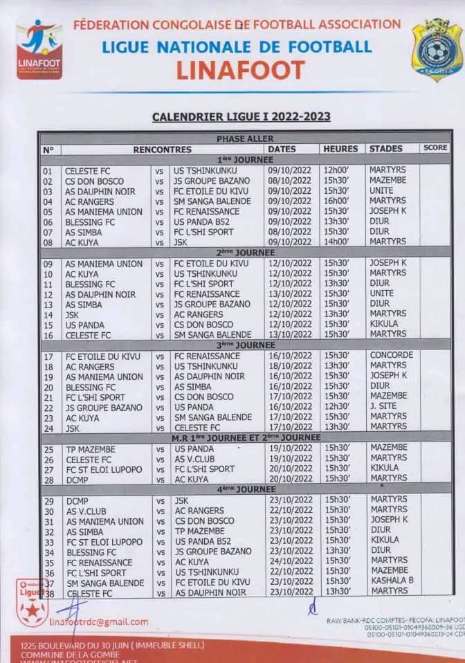 le calendrier de la 28e édition de la ligue nationale de football, Vodacom ligue1 saison sportive 2022-2023 a été dévoilé par le comité de gestion de la linafoot mercredi 28 septembre dernier.
